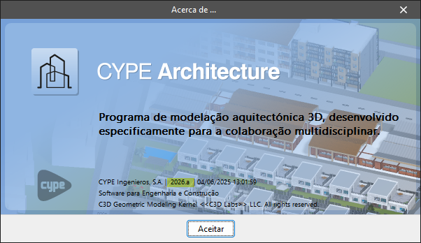 Para saber qual a é versão e número de licença que está sendo utilizado num programa CYPE, abra o menu "Ajuda" na parte superior do programa e clique na opção "Acerca de":
