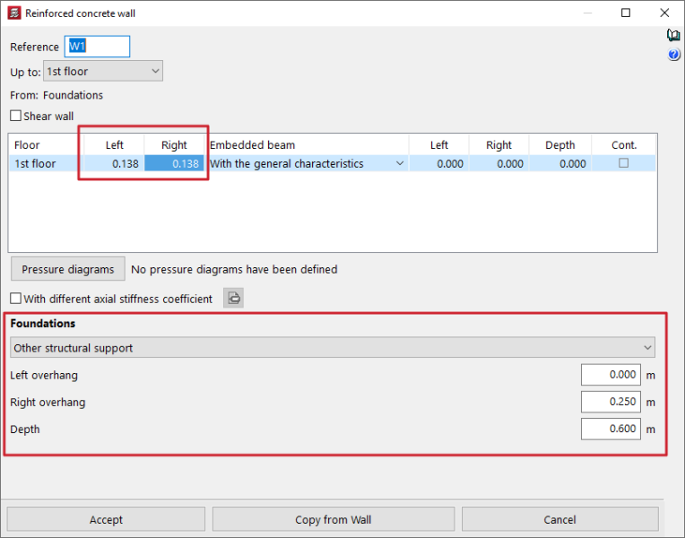To do this, once you have chosen the type of wall you wish to enter ("Reinforced concrete wall", "Reinforced concrete block wall" or "Masonry wall"), a window will open in which you can set the height of the wall, as well as the floors on which it starts and ends. In this example, the foundation of the wall will be set as "Other structural support", which means that the wall starts directly on the floor slab or on a beam. You can then specify the depth of the beam on which the wall is supported.