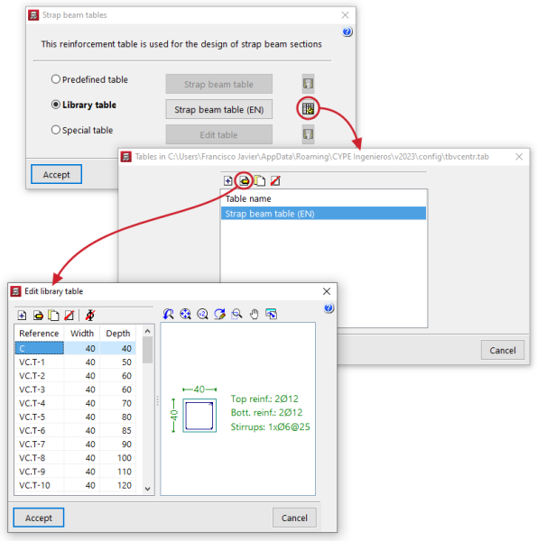 When entering strap or tie beams between footings, the program selects a beam from the predefined table of strap and tie beams, which allows the verification of the minimum forces and constructive arrangements according to the set configuration.