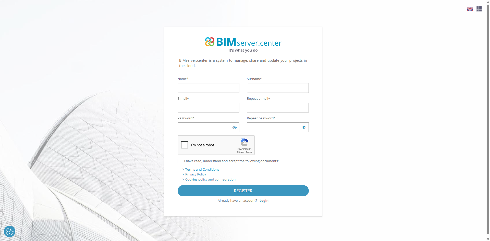 Once registration is complete, you must log in to BIMserver.center with your account as follows: