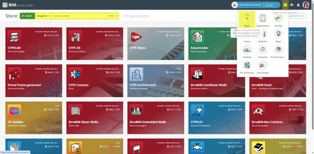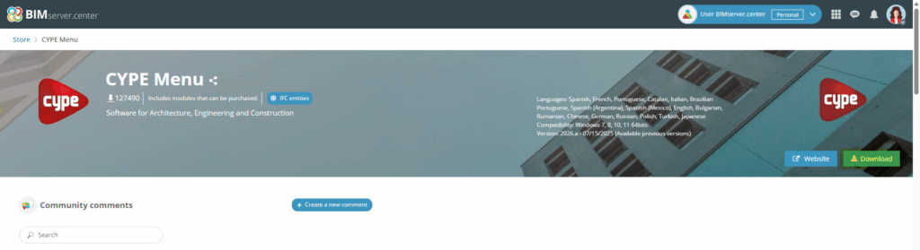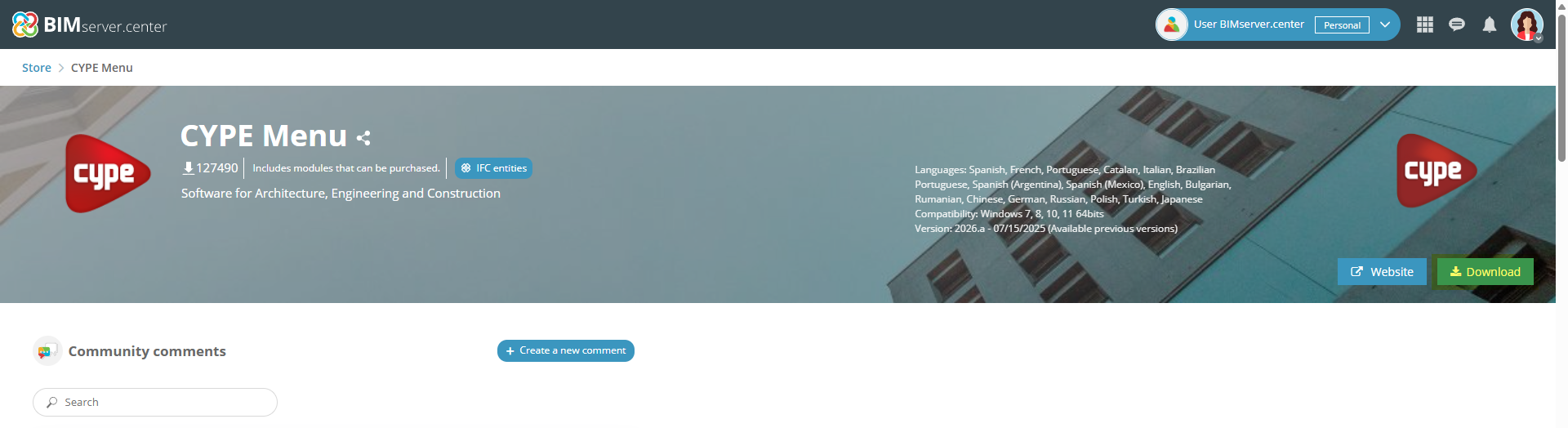 In BIMserver.center, users can search for the desired application, e.g. CYPE Menu, and download it: