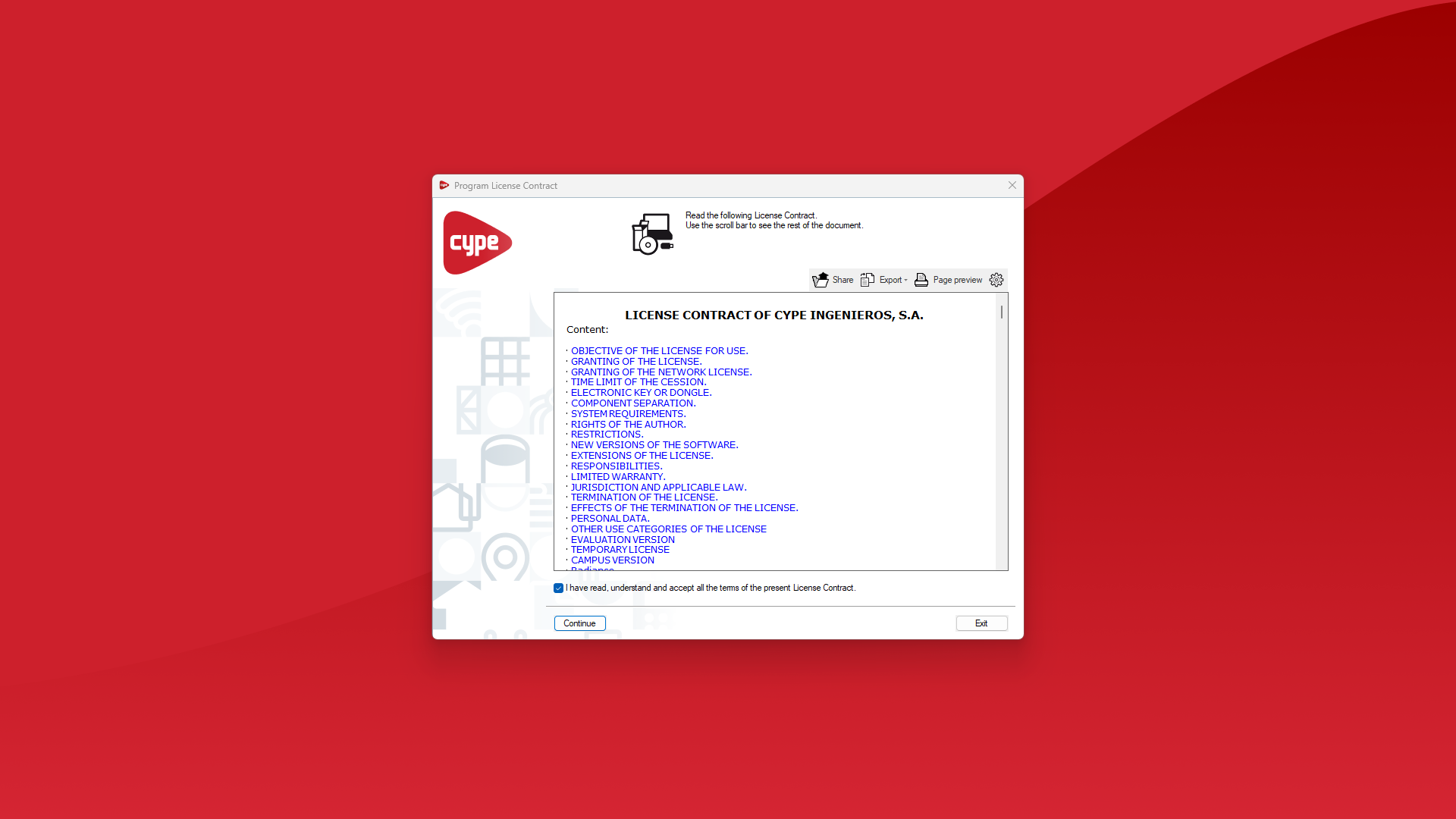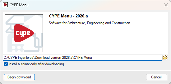 - If "Install automatically after downloading" has been checked in the previous step, the installation wizard will be launched automatically. If not, the installation executable in the appropriate language must be found and opened in the designated path, e.g. C:\CYPE Ingenieros\Download version 2026.a\CYPE Menu\Installation in English\Install CYPE Menu.exe. In the installation wizard, the License Agreement and the Responsibilities Clause must be accepted.