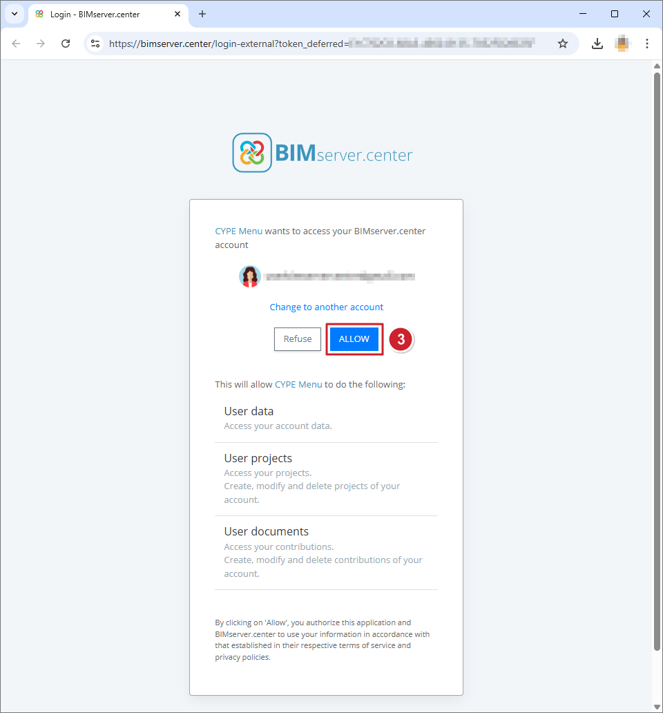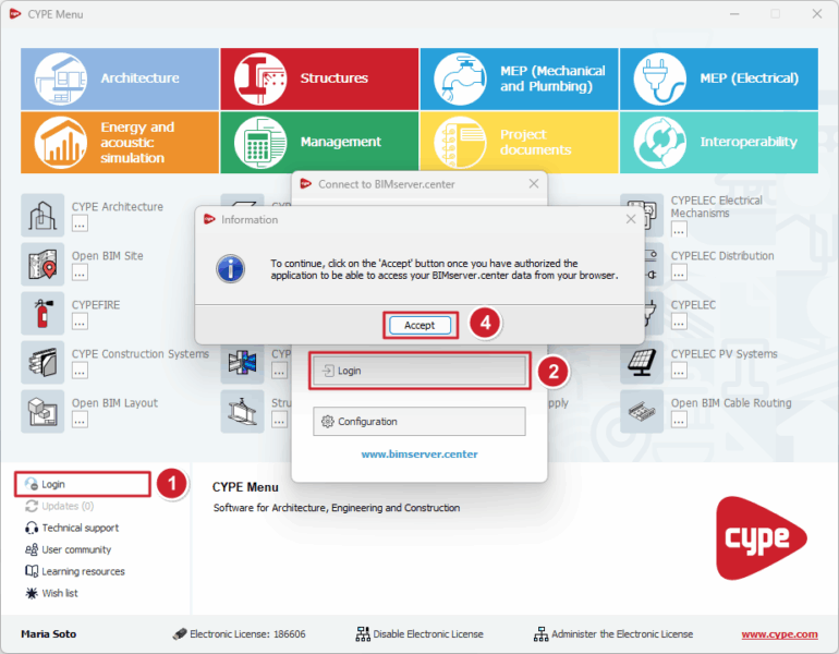 - Click on the "Log in" option at the bottom left (1) and then on the button of the same name in the pop-up window (2). A tab will open in the web browser with the message CYPE Menu wants to access your BIMserver.center account. Here, click on "ALLOW" (3) and then on the "Accept" button (4) in the "Information" window.