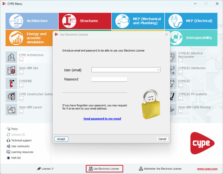 Then, also within the CYPE Menu, the email and password associated with the CYPE license must be entered by selecting the "Use Electronic License" option at the bottom.