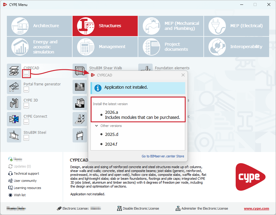 Note: The version of CYPE Menu. Full installation available in BIMserver.center usually corresponds to a lower version than the current version in CYPE Menu. - Download and install applications individually