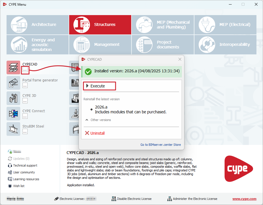 From the CYPE Menu interface, users can easily download, install, uninstall and update the required apps. This option provides centralised management that facilitates quick access to the apps included in the license. - Download and install CYPE Menu. Full installation