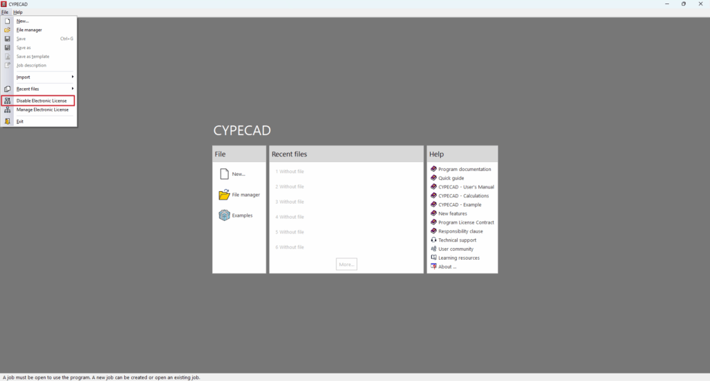 If an electronic license is being used, the "Disable Electronic License" option (instead of "Use electronic licence") will appear in the CYPE Menu interface or when opening the "File" menu again within each program.
