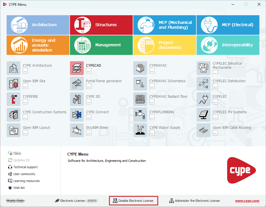 Note: If a CYPE app is installed individually, the electronic license can be managed from its interface as indicated in the "Additional information" section on this page.
