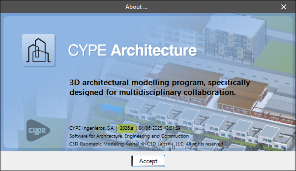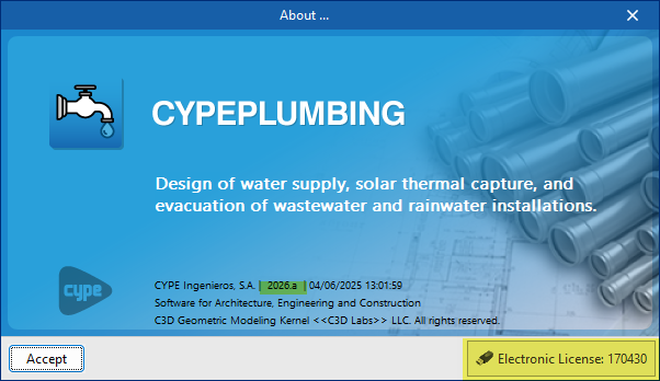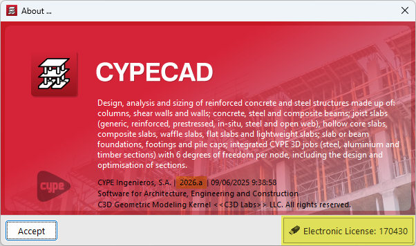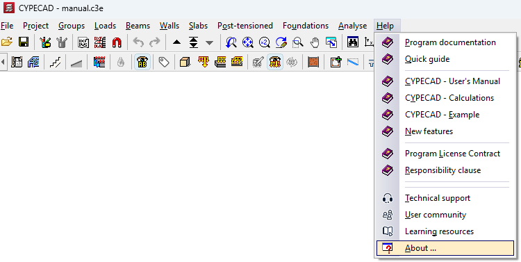 To identify the version and license number you are using in a CYPE program, the “Help” menu located at the top of the program must be opened and the “About” option selected: