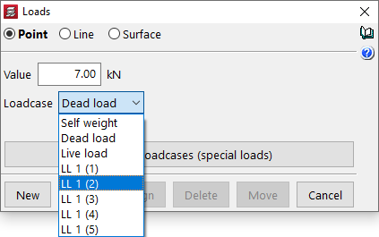Once the load case has been created, simply model the loads graphically from the "Loads" menu in the "Beam definition" tab. Moving loads are modelled in the same way as any other load, whether point, line or surface. Make sure the load is correctly attributed to the affected area: