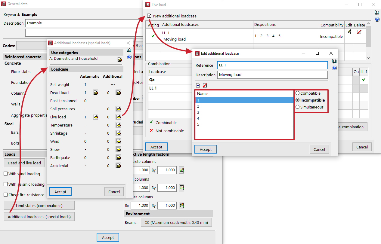 Then, a series of possible moving load positions are defined and designated as either "Compatible" with each other, "Incompatible" with each other or "Simultaneous".