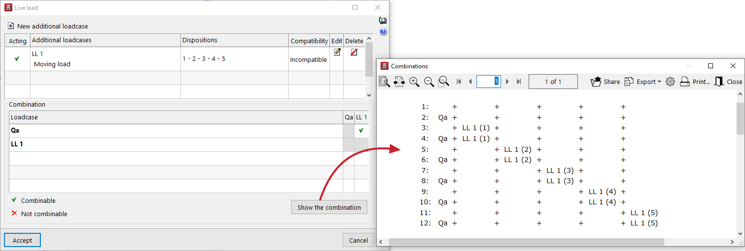 Once the load case has been created, it can be checked with the option "Show the combination" that each of the positions will be considered independently during the analysis: