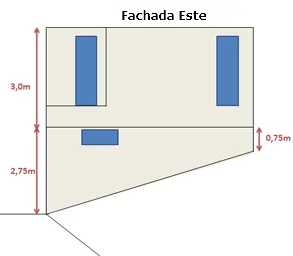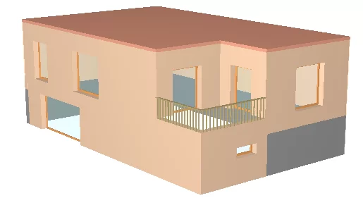 Cabe destacar que para un terreno nivelado no existe ningún problema de definición. No obstante, en un terreno en pendiente (como el de este ejemplo), no es posible definir la zona en contacto con el suelo como una superficie “triangular”. Una solución sencilla consiste en calcular manualmente la superficie implicada y dividir las fachadas en dos partes: una parte permanecerá definida como “Muro de sótano” (con una superficie de contacto rectangular equivalente a la superficie total del triángulo) y la otra parte pasará a estar definida como "Cerramiento".