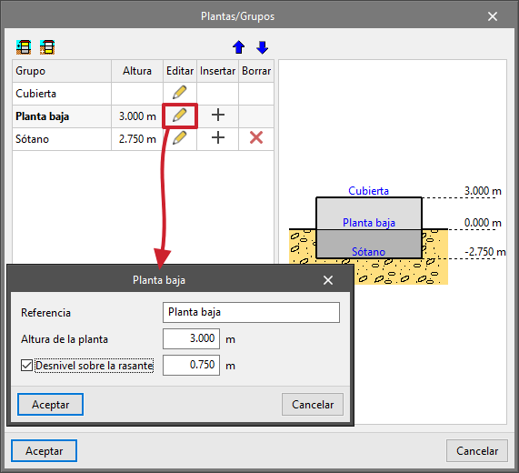 En primer lugar, desde “Obra” > “Plantas/Grupos” se define como “Sótano” la planta que está en contacto con el suelo y se establece un desnivel positivo para la planta inmediatamente superior.
