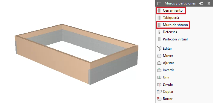 En este ejemplo se han definido tres tramos de “Muro de sótano” para que se considere que están en contacto con el terreno. El cuarto tramo se definió como "Cerramiento" a fin de considerarlo en contacto con el exterior.