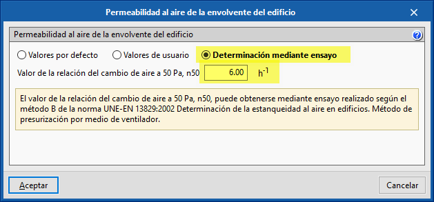Finalmente, está la posibilidad de colocar un valor de "Determinación mediante ensayo" para dicho parámetro en base a lo que establece la norma UNE-EN ISO 9972:2019 Prestaciones térmicas de los edificios. Determinación de la permeabilidad al aire de los edificios. Método de presurización con ventilador (anteriormente, UNE-EN 13829:2002 Determinación de la estanqueidad al aire en edificios. Método de presurización por medio de ventilador), a la cual habrá que recurrir en determinadas obras.
