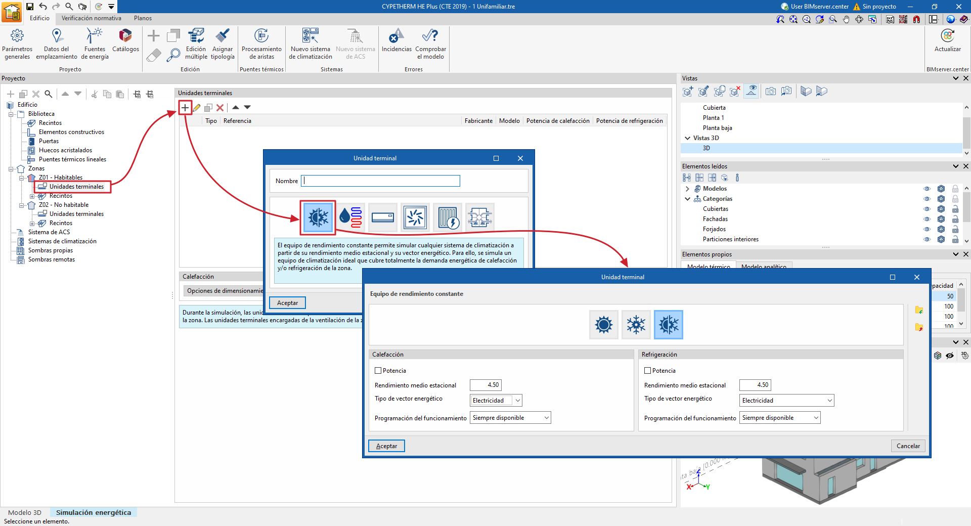 Para definir un equipo o sistema que no se encuentre disponible en las opciones o catálogos del programa, es posible introducir un “Equipo de rendimiento constante” desde el menú “Unidades terminales” de cada zona (también puede utilizar el asistente “Nuevo sistema de climatización” de la barra de herramientas superior):