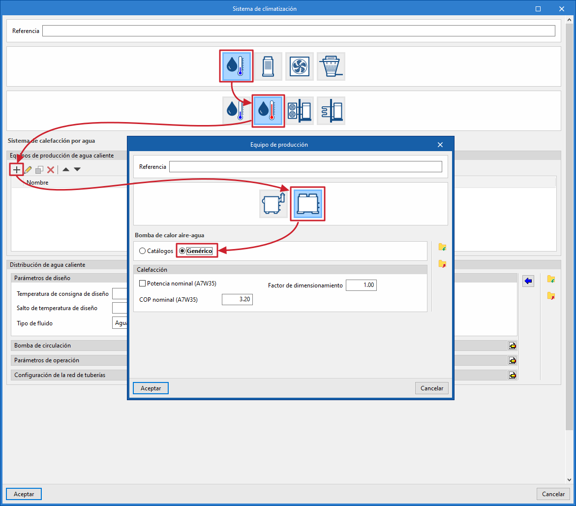 - En el segundo sistema, utilice una "Bomba de calor aire-agua" de tipo "Genérico" (disponible dentro de "Sistema de climatización por agua > Sistema de calefacción por agua") para modelar el comportamiento de la bomba de calor reversible en modo calor.