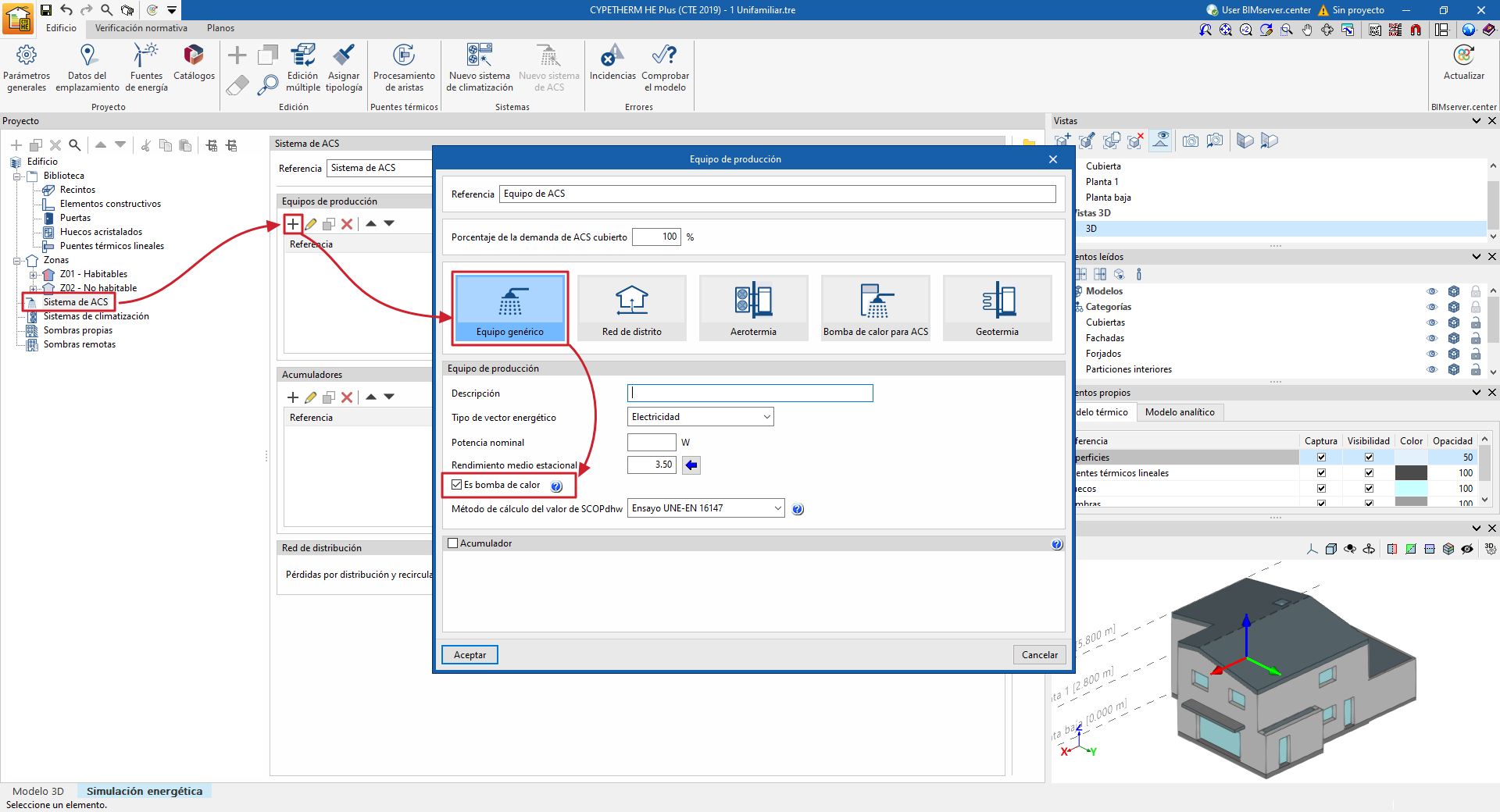 En el caso de equipos de aerotermia para ACS de fabricantes que no están disponibles en el programa, dentro del apartado "Sistema de ACS" puede crear un equipo de producción definido como "Equipo genérico" cuyo "Tipo de vector energético" sea "Electricidad", activando después la casilla "Es bomba de calor" y definiendo su "Potencia nominal" y su "Rendimiento medio estacional".