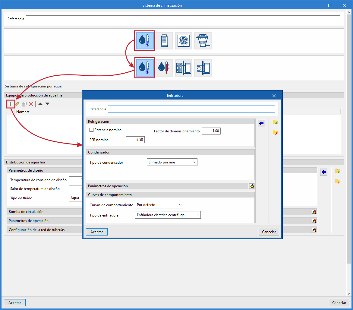 - En el primer sistema, defina una "Enfriadora" (disponible dentro de "Sistema de climatización por agua > Sistema de refrigeración por agua") para modelar el comportamiento de la bomba de calor reversible en modo frío.
