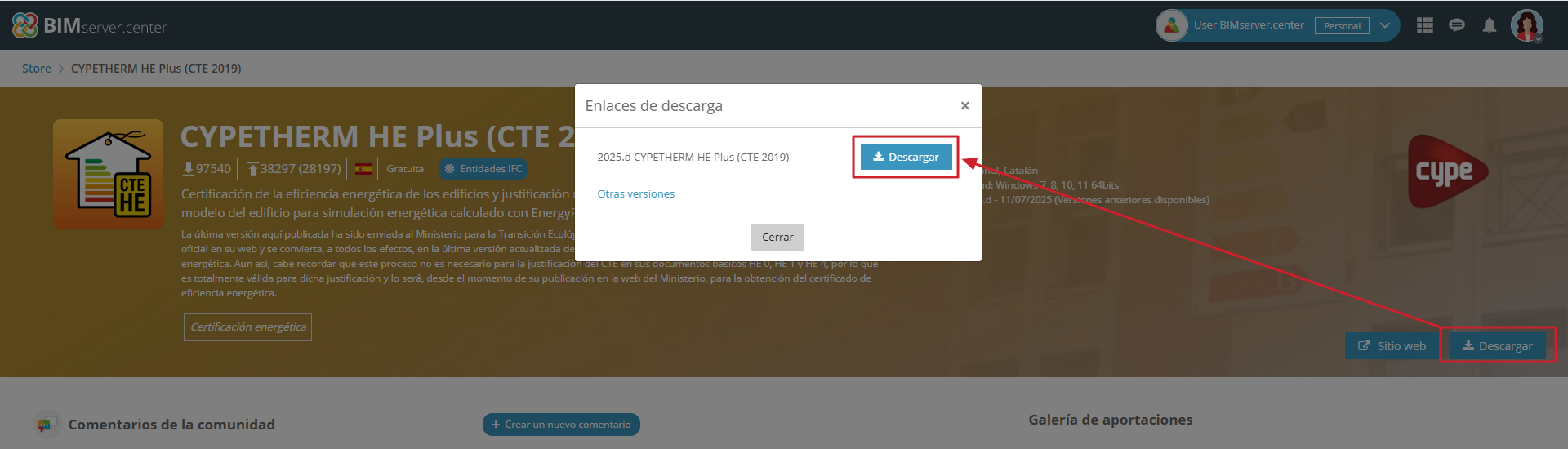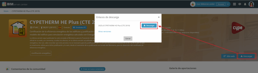 Después, se descarga e instala CYPETHERM HE Plus desde BIMServer.center. Se puede acceder directamente pulsando aquí. CYPETHERM HE Plus, como el resto de herramientas reconocidas, también se puede descargar desde la página web del ministerio.