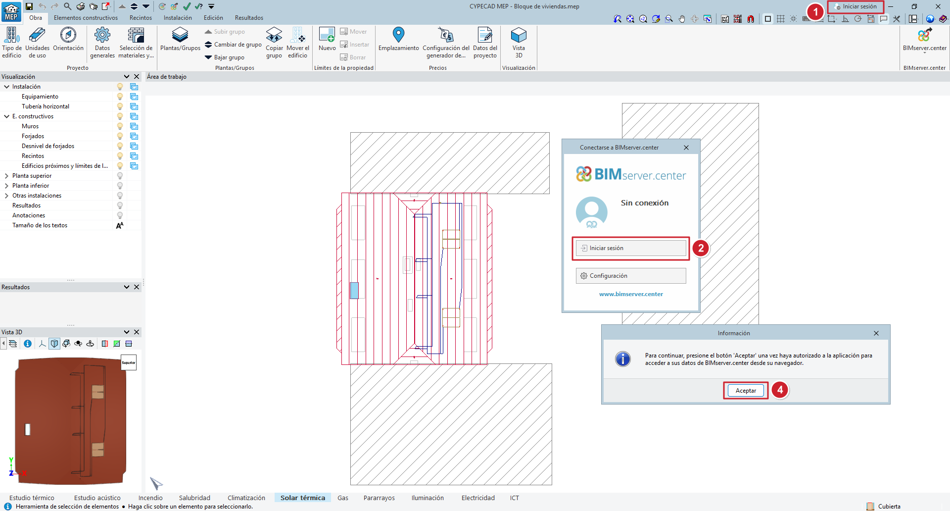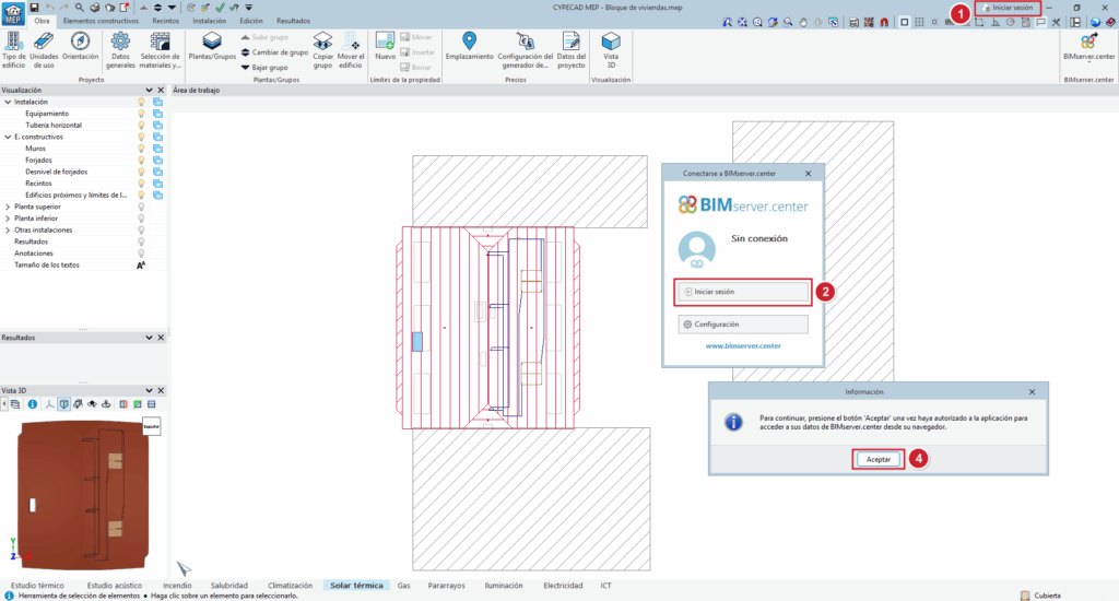 Tras ejecutar CYPECAD MEP, se pulsa sobre el botón "Iniciar sesión" de la parte superior de la interfaz principal y se introduce el usuario y la contraseña de la cuenta de BIMserver.center para identificarse nuevamente.