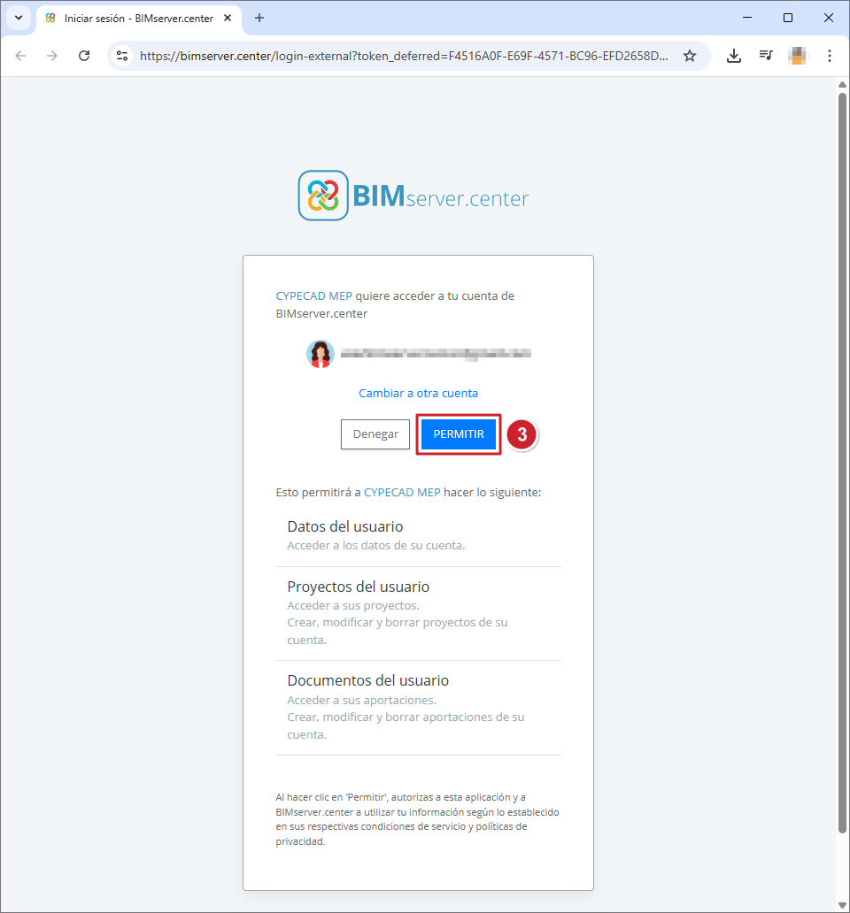 En el siguiente panel, hay que pulsar sobre el botón "Iniciar sesión" e identificarse nuevamente con el usuario y la contraseña de la cuenta de BIMserver.center.