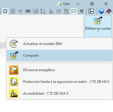 Una vez esté abierta la obra de CYPECAD MEP que se desea exportar, hay que situarse en la pestaña "Climatización", en el caso de tener las instalaciones térmicas desarrolladas, o en la pestaña "Estudio térmico" en otros casos. Para exportar de CYPECAD MEP a BIMserver.center se debe acceder al menú "BIMserver.center" de la parte superior derecha de la interfaz y seleccionar la opción "Compartir".