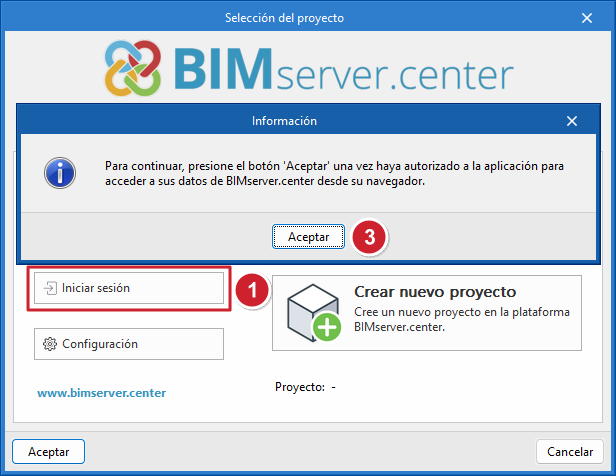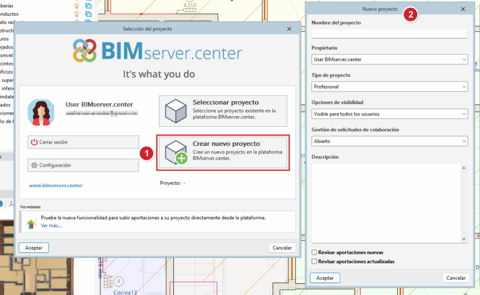 En este momento se puede seleccionar un proyecto ya creado en BIMserver.center o, lo más sencillo, crearlo directamente desde el programa pulsando en "Crear nuevo proyecto" y rellenando los datos necesarios en la ventana emergente.