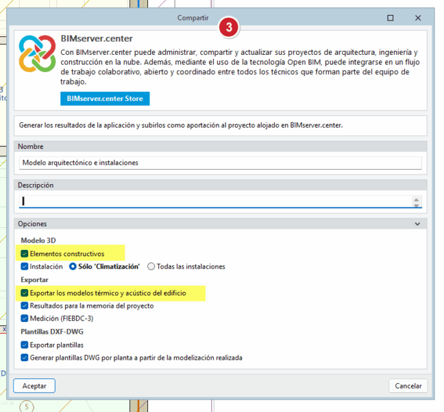 En el panel de exportación, es necesario activar la opción "Exportar los modelos térmico y acústico del edificio". Esta opción permite la exportación de la información de capas de materiales, descripción de recintos y zonas térmicas, así como de las instalaciones introducidas.