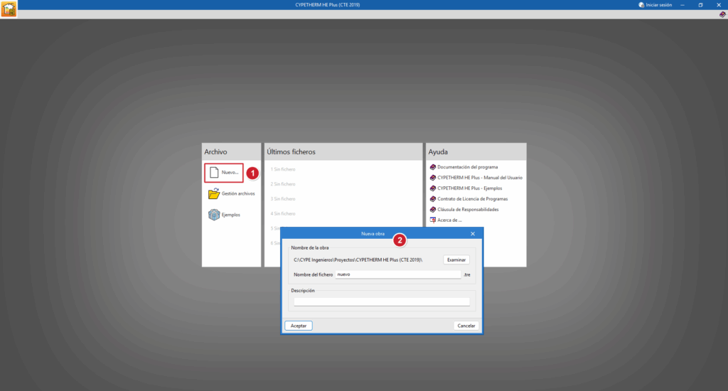 A continuación, se abre CYPETHERM HE Plus y se pulsa en "Nuevo" en la parte izquierda para abrir un archivo nuevo. En la ventana emergente se escribe un nombre y una descripción para el fichero.
