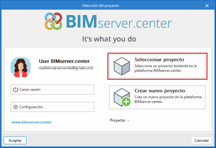A continuación, desde el mismo panel, se pulsa en "Seleccionar proyecto" para conectarse con el proyecto de BIMserver.center previamente creado.