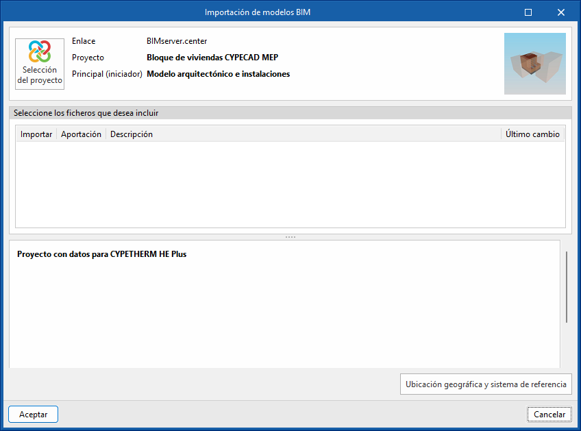 Tras aceptar, se accede a un ventana donde se indica "Proyecto con datos para CYPETHERM HE Plus". Se pulsa de nuevo en "Aceptar".