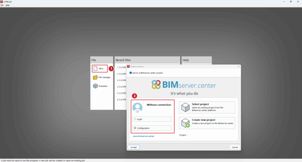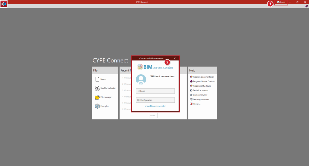 Después, se ejecuta CYPECAD o CYPE 3D. Nuevamente, hay que identificarse con una cuenta de BIMserver.center. Esto se puede hacer de dos formas diferentes: