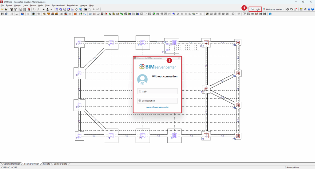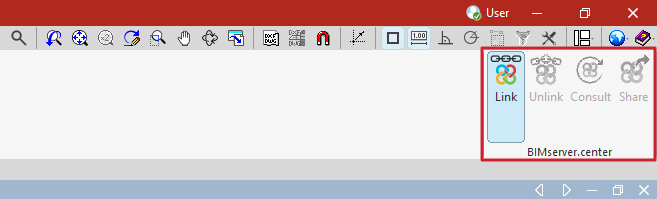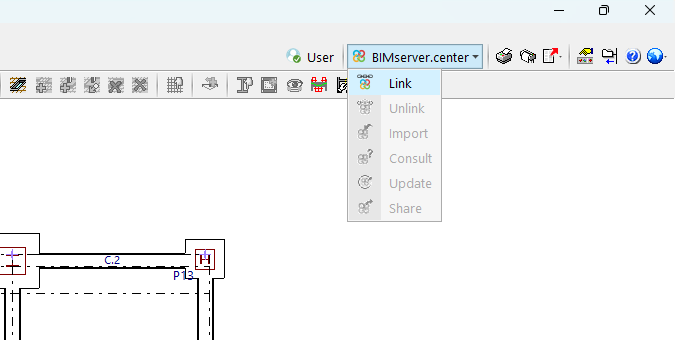 Desde el menú "BIMserver.center", se puede utilizar el botón "Vincular" para relacionar la obra con un proyecto de BIMserver.center. En CYPECAD, este menú está situado en la parte superior derecha.