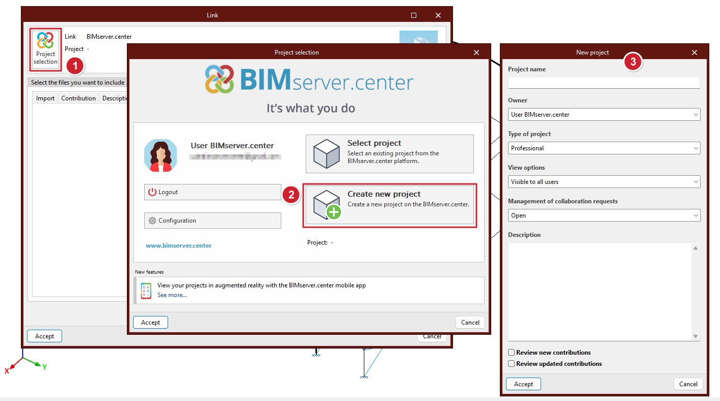 Después, en "Selección del proyecto", es posible seleccionar un proyecto de BIMserver.center creado previamente, o utilizar "Crear nuevo proyecto" para hacerlo en este momento: