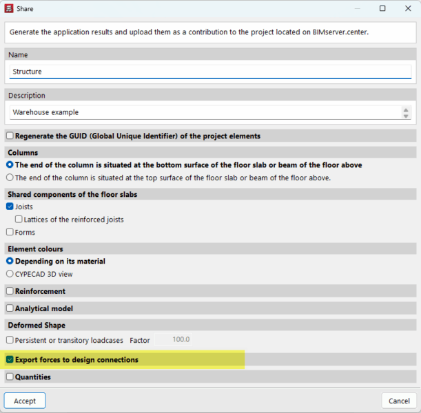 En la ventana de exportación del fichero en formato IFC, se marca la opción "Exportar los esfuerzos para el cálculo de las uniones":