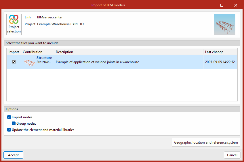 A continuación, es necesario abrir una obra "Nueva". El asistente de "Importación de modelos BIM" permite seleccionar el proyecto de BIMserver.center creado previamente.