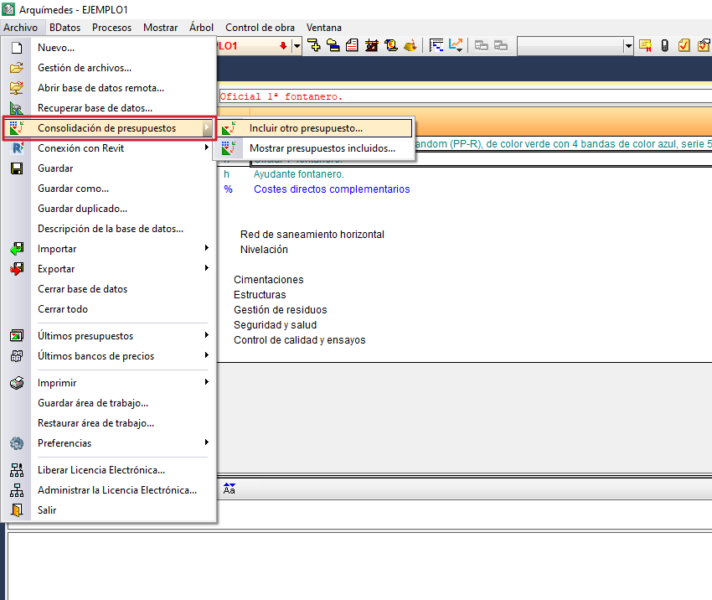 Una vez obtenidos los tres presupuestos desde CYPECAD, CYPECAD MEP y CYPE Construction Works en el formato propio de Arquímedes, es necesario consolidarlos en uno solo con la opción “Archivo > Consolidación de presupuestos” de este programa.