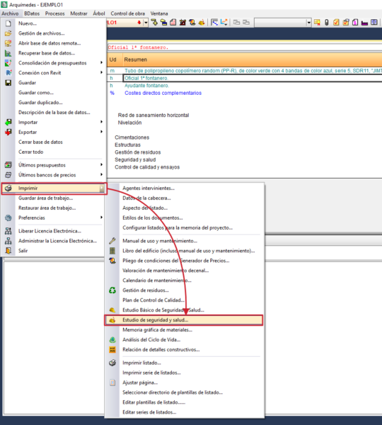 Por último, desde Arquímedes se puede generar el Estudio de seguridad y salud del presupuesto consolidado mediante la opción "Archivo > Imprimir > Estudio de seguridad y salud".