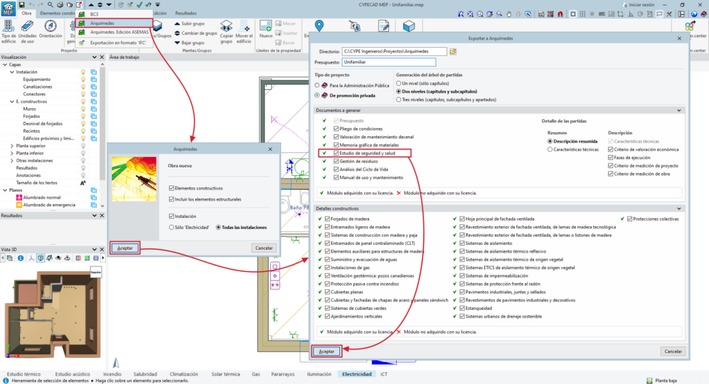 Se debe utilizar Arquímedes para generar el Estudio de seguridad y salud que contenga las unidades de obra contempladas en cada uno de estos programas. Para obtener el Estudio de seguridad y salud en un proyecto en el que se están utilizando los programas CYPECAD, CYPECAD MEP y CYPE Construction Works, siga estos pasos: