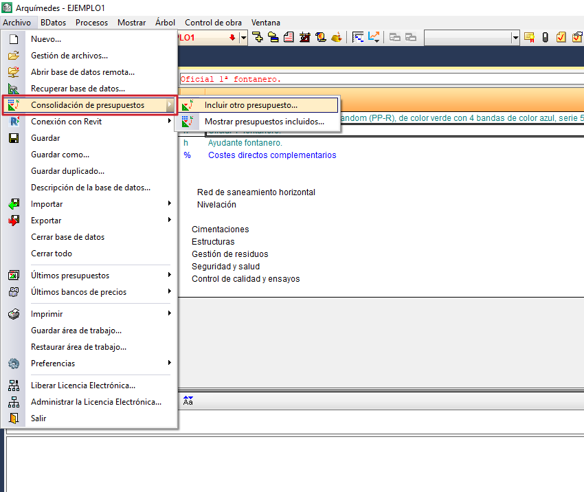 Una vez obtenidos los tres presupuestos desde CYPECAD, CYPECAD MEP y CYPE Construction Works en el formato propio de Arquímedes, es necesario consolidarlos en uno solo con la opción “Archivo > Consolidación de presupuestos” de este programa.