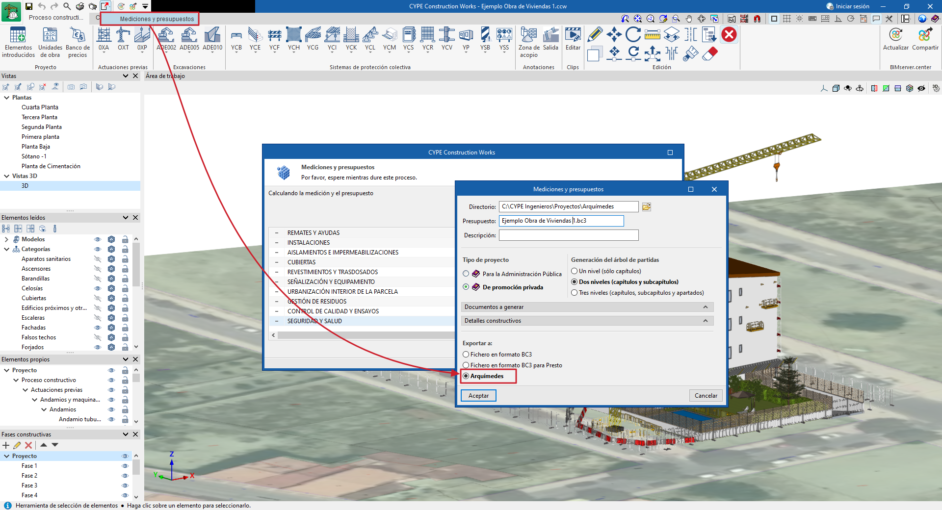 Pulse el botón "Exportar > Arquímedes" disponible en la barra de herramientas del título. Incorpore la información del "Estudio de seguridad y salud" en el proceso.