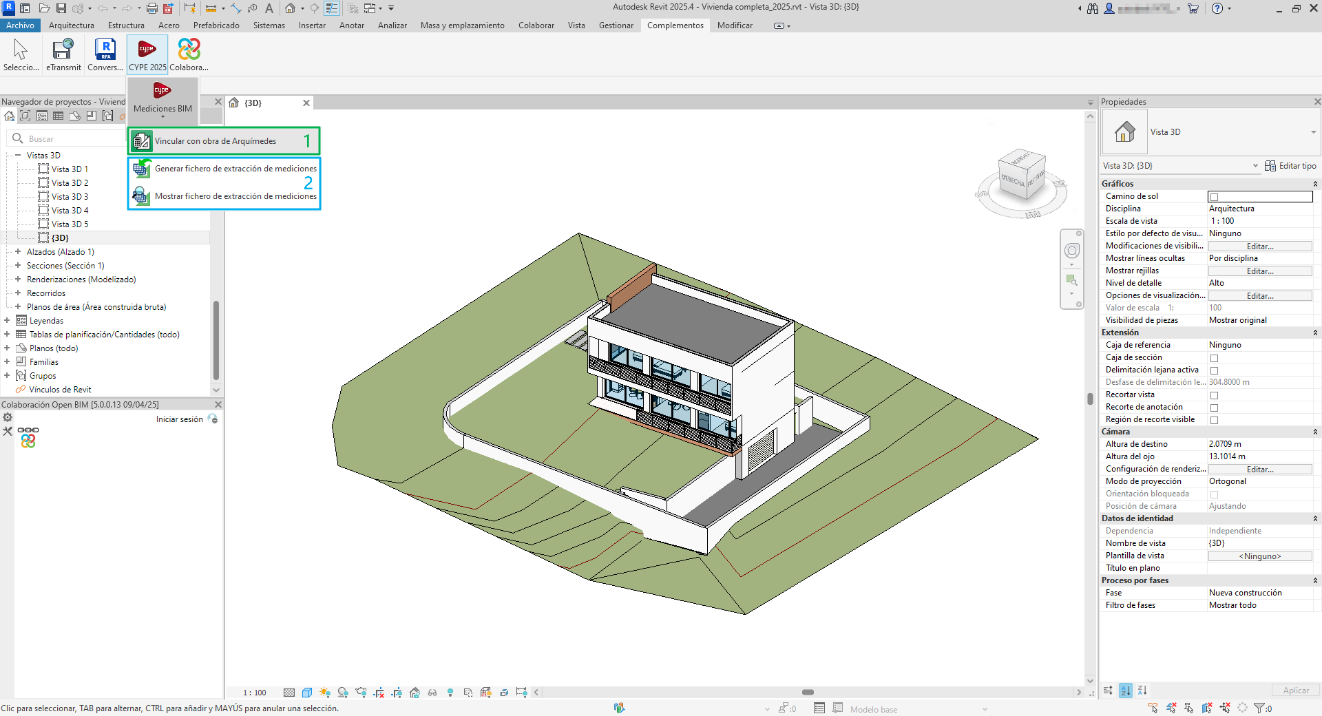 Sin embargo, para poder emplear la opción "Vincular con obra de Arquímedes", una vez instalado el Plugin MedBIM – Revit, es necesario abrir Arquímedes. De esta forma, en Revit se activa la opción "Vincular con obra de Arquímedes". Esta opción se señala en el recuadro 1 de la imagen.