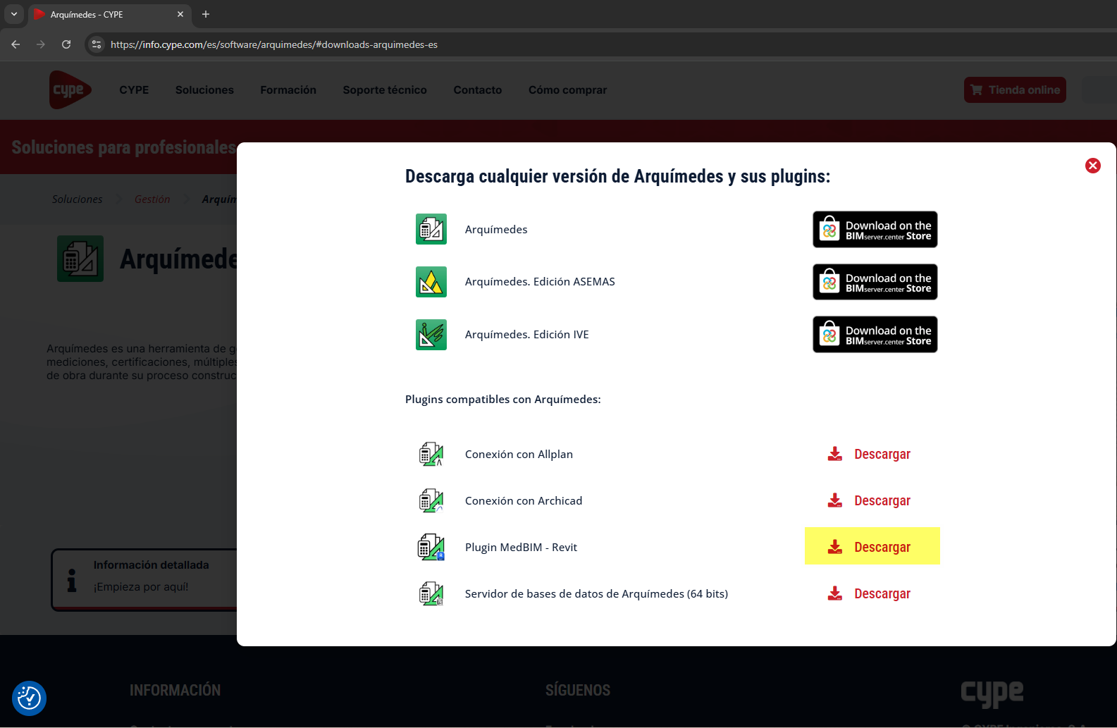 La instalación también se puede realizar pulsando sobre el fichero ejecutable Plugin MedBIM-Revit.exe disponible en el botón "Descargar" de la página web de Arquímedes, concretamente desde el apartado "Plugins compatibles con Arquímedes".
