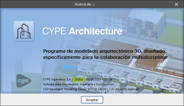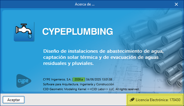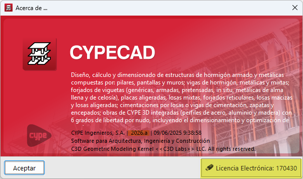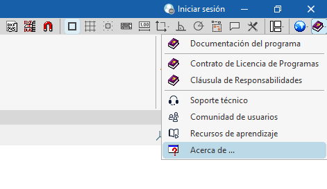 Para conocer la versión y el número de licencia que está utilizando en un programa de CYPE, abra el menú "Ayuda" de la parte superior del programa y pulse sobre la opción "Acerca de":
