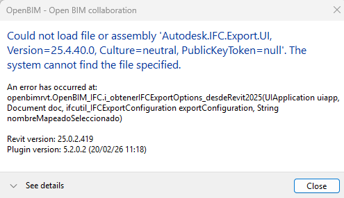 Este error no está provocado por el Plugin, sino por la falta de actualización de Revit o de la extensión oficial de exportación IFC de Autodesk.