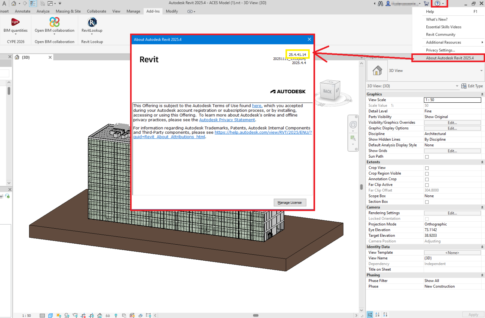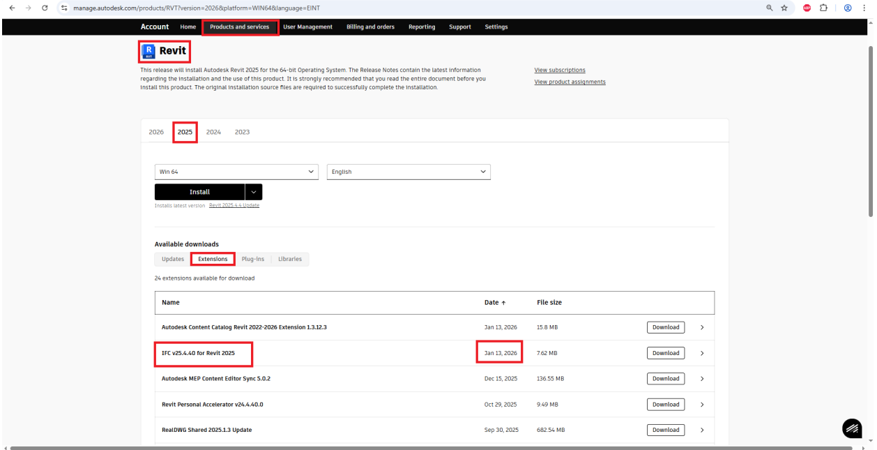 En primer lugar, debe verificarse que está instalada la última versión disponible de Revit. Por ejemplo, para Revit 2025, la última versión disponible (a fecha de 9 de febrero de 2026) se puede visualizar en: