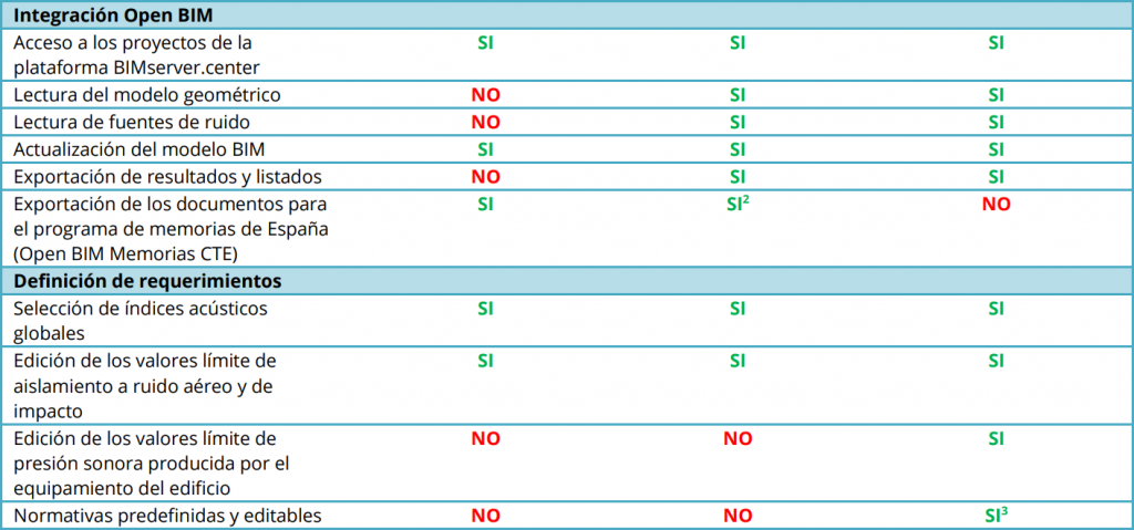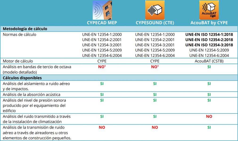 En la siguiente tabla se muestran las diferencias entre las aplicaciones de análisis acústico de CYPE (CYPECAD MEP, CYPESOUND y AcouBAT by CYPE):