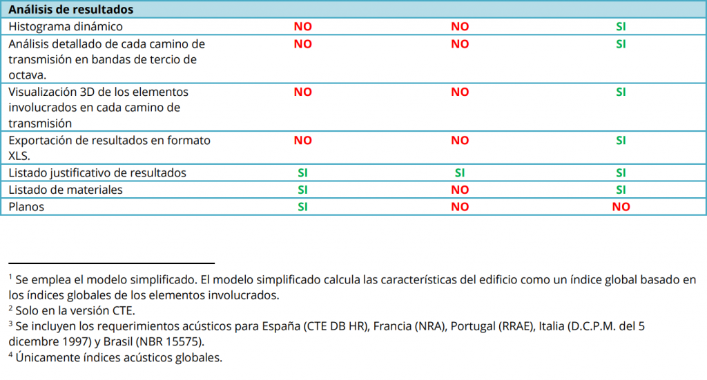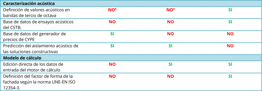 | Predicción del aislamiento acústico de las soluciones constructivas | SÍ | SÍ | NO |